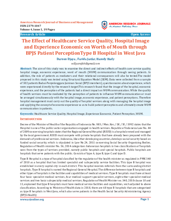 Pdf The Effect Of Healthcare Service Quality Hospital Image And Experience Economic On Worth Of Mouth Through Bpjs Patient Perceptiontype B Hospital In West Java Editorial Department Academia Edu